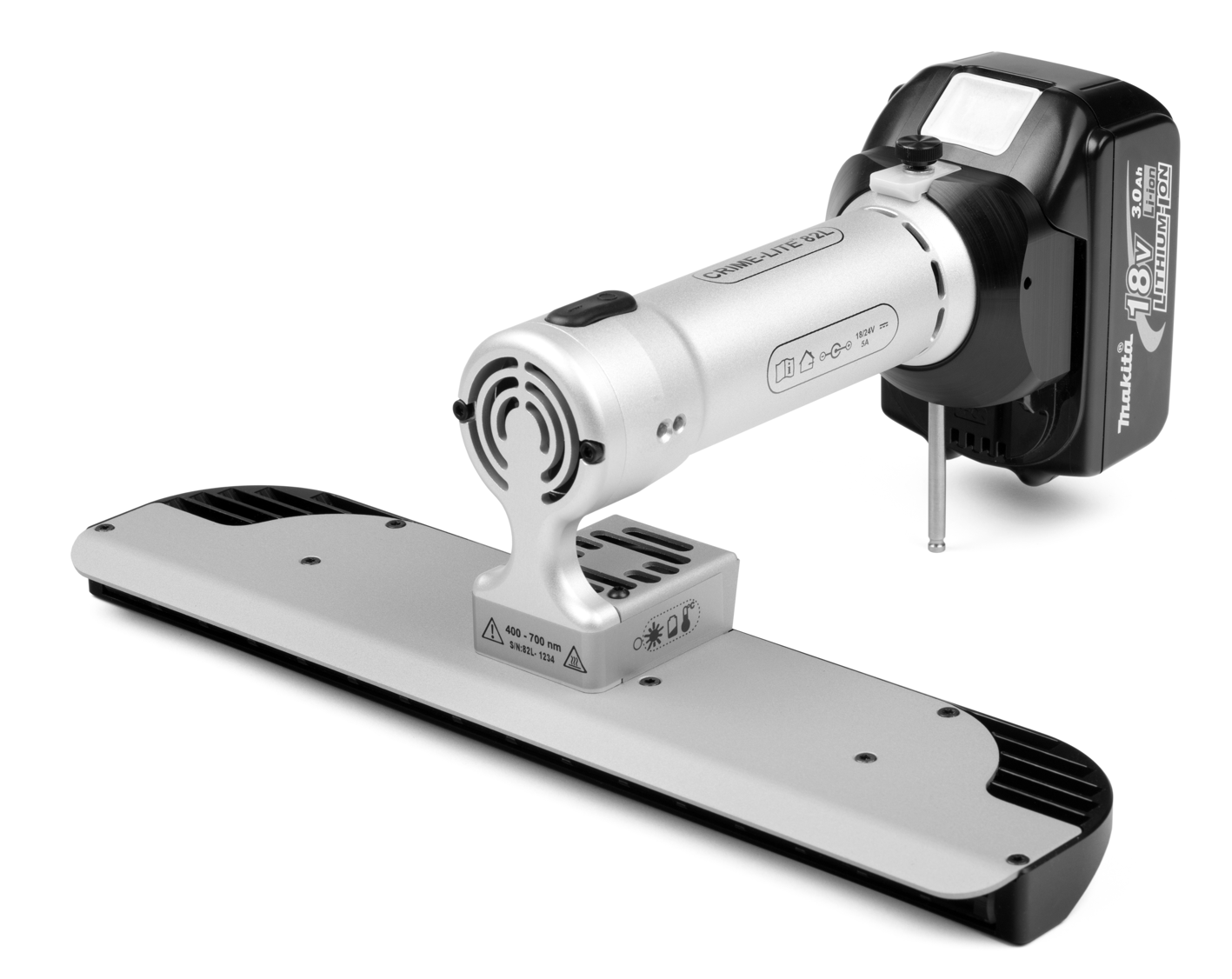 The worlds most powerful handheld led forensic light source: 96 high power LEDs providing 115 Watts of narrowband illumination.